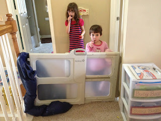 So, to make sure no children are MIA, I make use of lots of baby gates.  I gate children out of rooms; I gate them in rooms.  I have to keep them where I can see them and out of important things like the permanent markers.  (Yes, I learned that one the hard way too.)  Toddler proofing your house is essential to success.